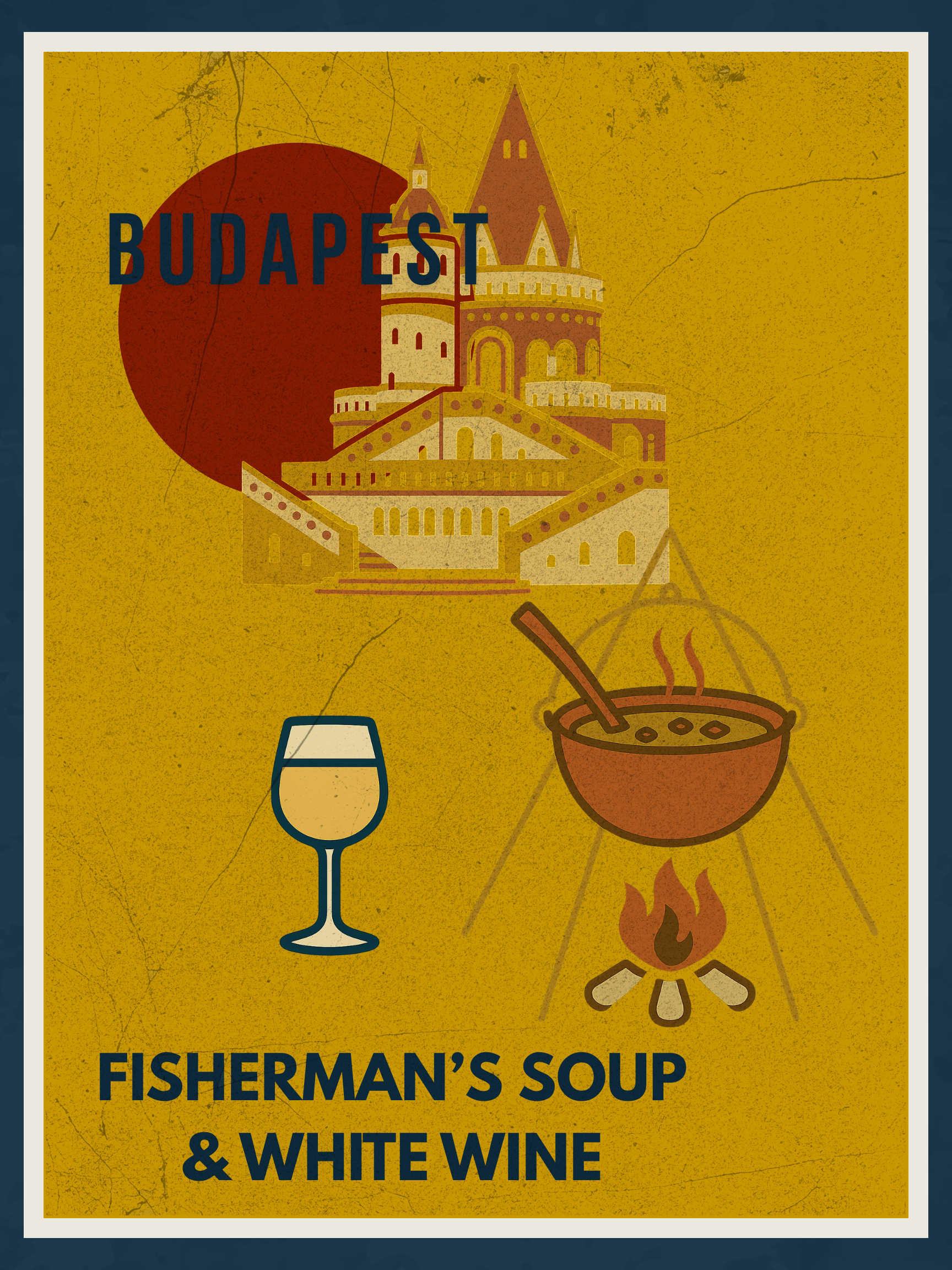 Budapest hat einen unverwechselbaren Duft: warme Paprika, frischer Fisch, ein Hauch Donau. Fisherman’s Soup & White Wine bringt genau dieses Gefühl auf Papier – ein dampfender Kessel Halászlé über offenem Feuer, ein Glas kühler Weißwein und die märchenhaften Türme der Fischerbastei, die über die Stadt wachen. Ein Poster, das Tradition, Geschmack und Atmosphäre verbindet.
