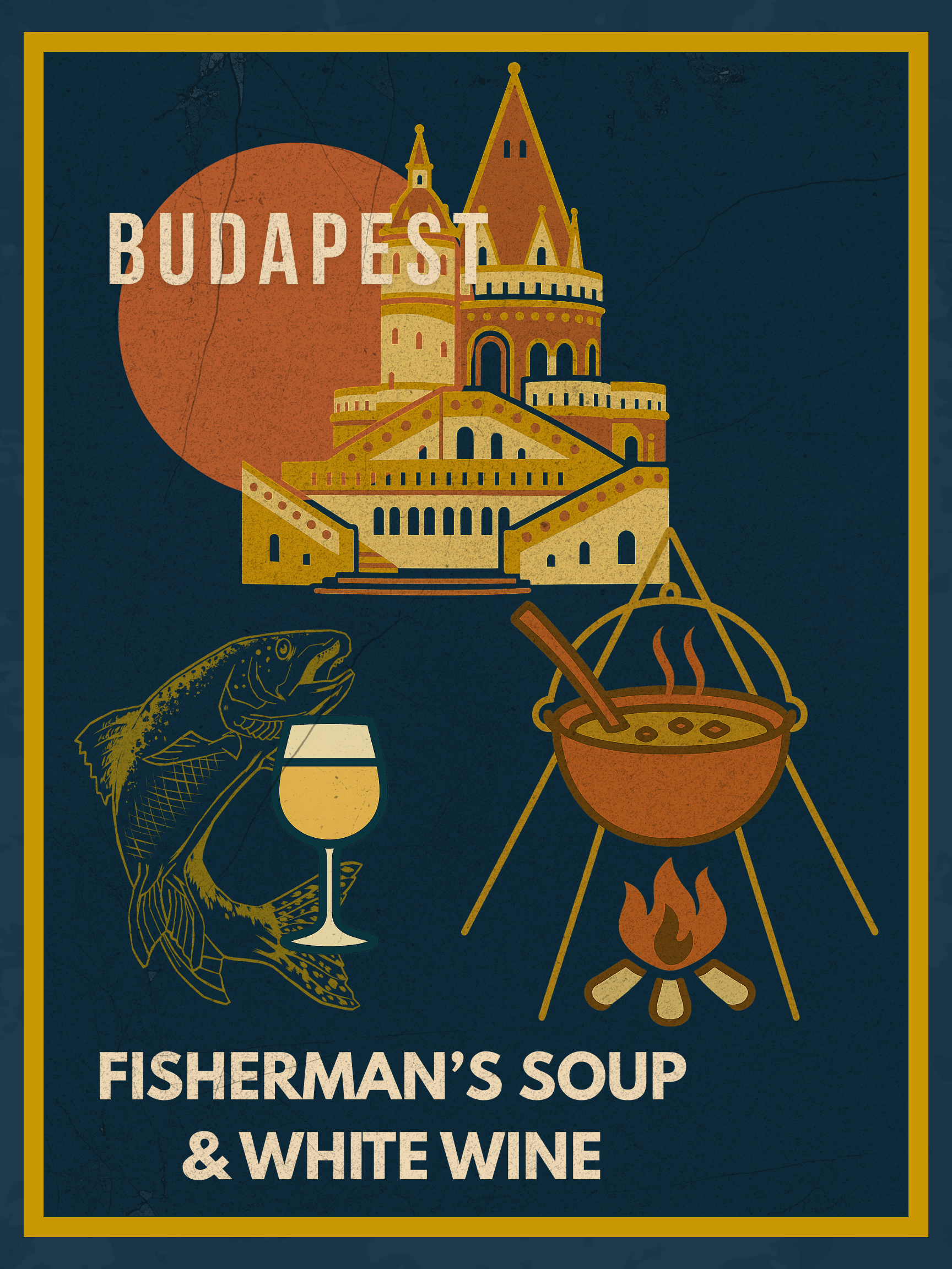 Ein paprika-roter Budapester Genussmoment – Halászlé über offenem Feuer, frischer Weißwein und die Türme der Fischerbastei in einem kunstvollen Poster.