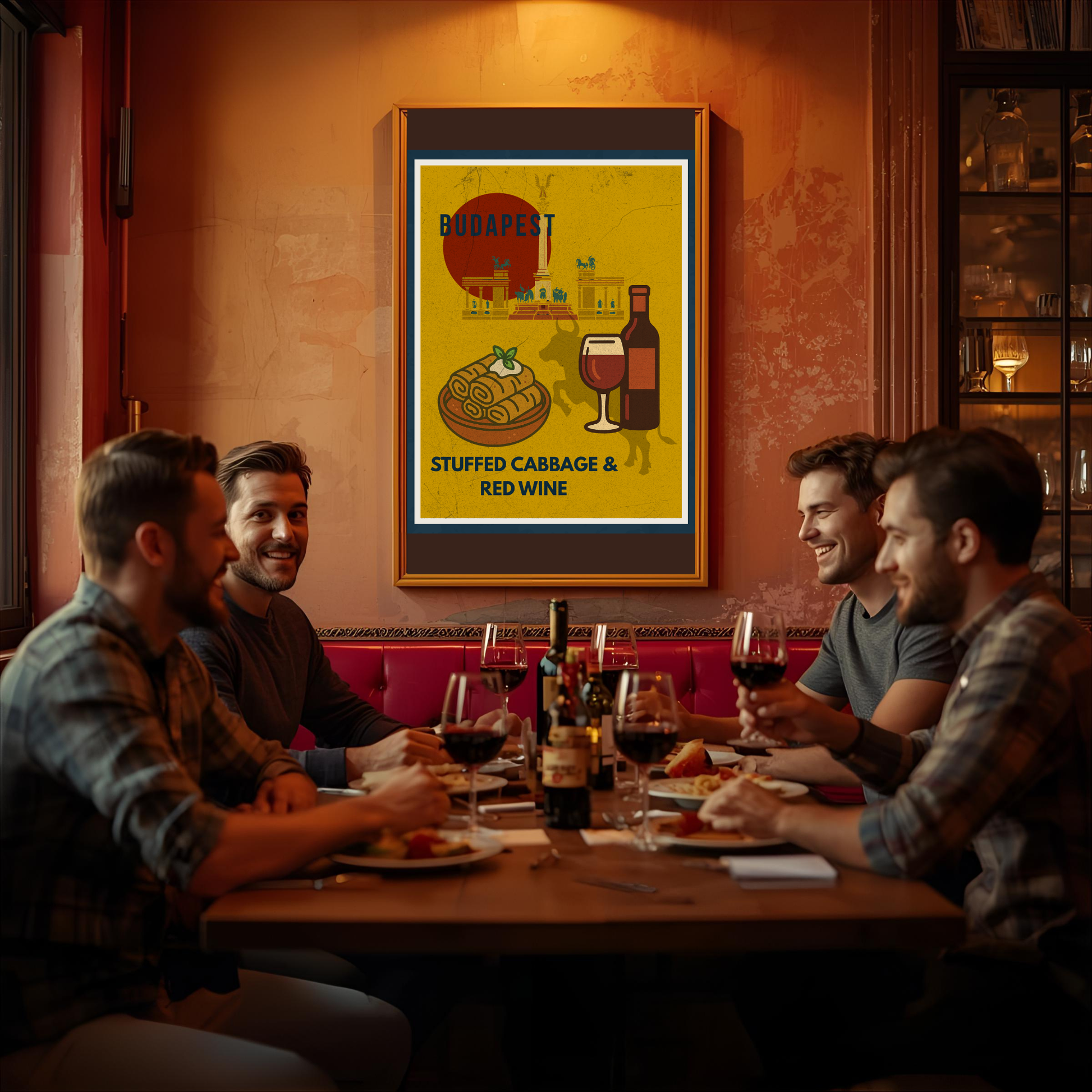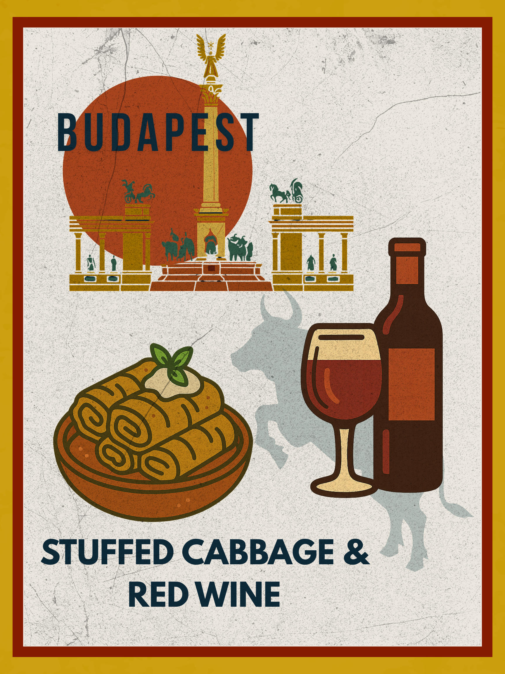 Vannak ételek, amelyek nemcsak finomak – hanem egy város lelkét mesélik el. A Stuffed Cabbage & Red Wine poszter a magyar töltött káposzta paprikás, mély, otthonos ízvilágát kapcsolja össze a modern magyar vörösbor eleganciájával. A háttérben a Hősök tere emelkedik, Budapest egyik legikonikusabb helyszíne, amely kulturális ritmust és meleg hangulatot ad a grafikának.